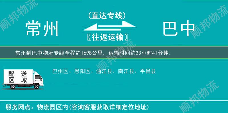 欢迎来电咨询常州到巴中物流专线相关信息,天天发货,全程3-7天可将您的货物送至巴中全市:平昌县、南江县、恩阳区、通江县、巴州区、。