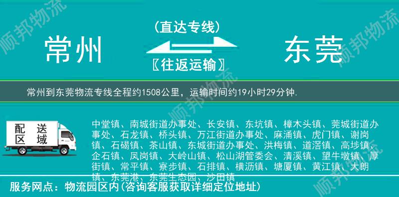 常州到东莞物流专线全程约1508公里,专线运输耗时约19小时29分钟。常州到东莞物流专线是顺邦物流推出的从常州到东莞的物流专线直达运输,提供常州到东莞货运公司电话查询价格和费用,快速安全将货物送达,做用户放心的货运物流服务商。