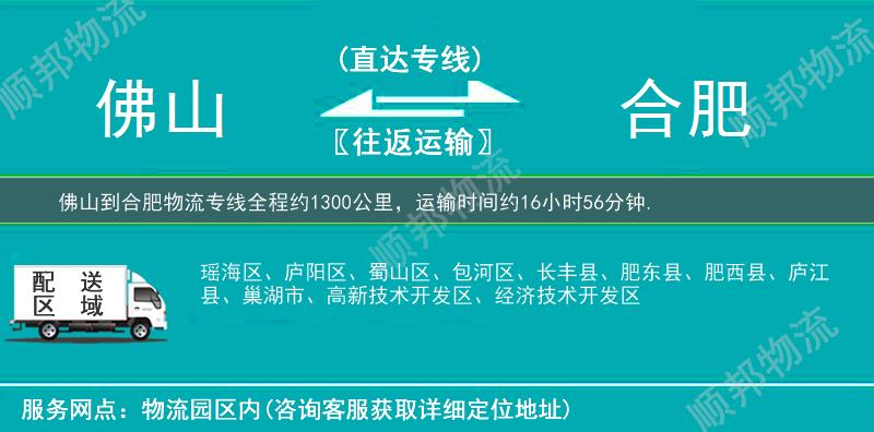 佛山到合肥物流专线专业是顺邦物流重点运营货运专线,提供佛山至合肥搬家行李托运,冷链运输,大件运输,航空托运,小轿车托运,电商物流,整车零担货运,超市配送业务。佛山到合肥物流专线全程约1300公里,专线运输耗时约16小时56分钟。