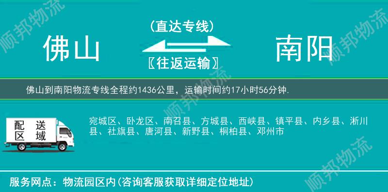 佛山到南阳物流专线全程约1436公里,专线运输耗时约17小时56分钟, 佛山到南阳物流专线是顺邦物流的主营运输专线,每日定时发车,高速直达。佛山到南阳专线提供零担整车、大件、仓储配送、展会、包车等多种运输方式,让客户轻松享受"足不出户,货到南阳"的物流运输服务。