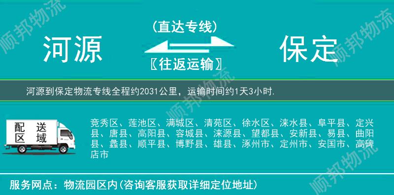 河源到保定物流专线全程约2031公里,专线运输耗时约1天3小时, 河源到保定物流专线是顺邦物流重点打造物流线路之一,找河源到保定物流公司就选顺邦物流,我们将竭诚为您提供专业河源到保定物流货运服务。