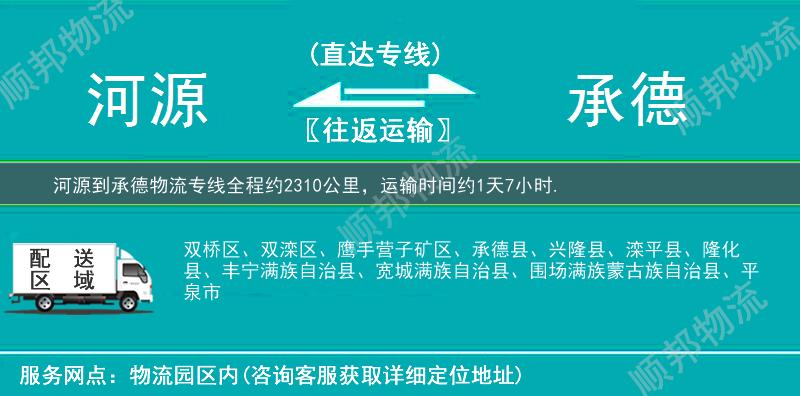 河源到承德物流专线全程约2310公里,专线运输耗时约1天7小时, 河源到承德物流专线是顺邦物流重点打造物流线路之一,找河源到承德物流公司就选顺邦物流,我们将竭诚为您提供专业河源到承德物流货运服务。
