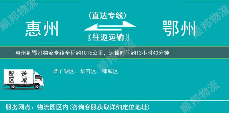 惠州到鄂州物流专线全程约1016公里,专线运输耗时约13小时40分钟, 惠州到鄂州物流专线是顺邦物流的主营运输专线,每日定时发车,高速直达。惠州到鄂州专线提供零担整车、大件、仓储配送、展会、包车等多种运输方式,让客户轻松享受"足不出户,货到鄂州"的物流运输服务。