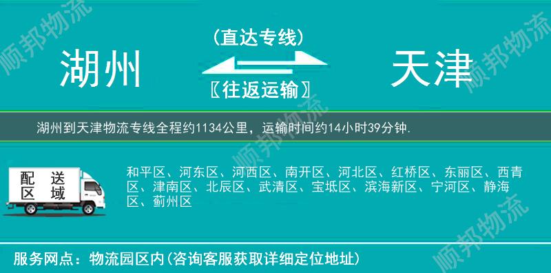 湖州到天津物流专线专业是顺邦物流重点运营货运专线,提供湖州至天津搬家行李托运,冷链运输,大件运输,航空托运,小轿车托运,电商物流,整车零担货运,超市配送业务。湖州到天津物流专线全程约1134公里,专线运输耗时约14小时39分钟。