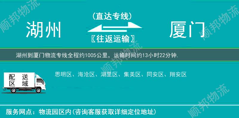 欢迎来电咨询湖州到厦门物流专线相关信息,天天发货,全程3-7天可将您的货物送至厦门全市:同安区、湖里区、海沧区、翔安区、思明区、集美区、。