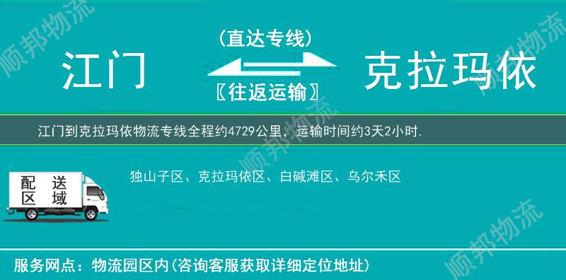 江门到克拉玛依物流专线全程约4729公里,专线运输耗时约3天2小时。 *江门到克拉玛依物流公司,专业江门到克拉玛依物流专线运输(上门取货 送货到门)从 江门发货运去克拉玛依、 江门发物流到克拉玛依,一站式 江门到克拉玛依专线直达物流。