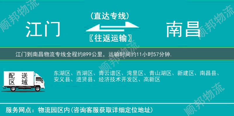 江门到南昌物流专线全程约899公里,专线运输耗时约11小时57分钟, 江门到南昌物流专线是顺邦物流的主营运输专线,每日定时发车,高速直达。江门到南昌专线提供零担整车、大件、仓储配送、展会、包车等多种运输方式,让客户轻松享受"足不出户,货到南昌"的物流运输服务。