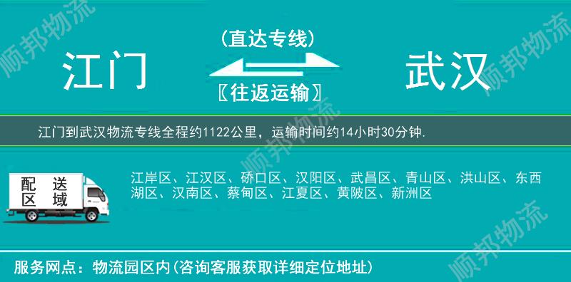 江门到武汉物流专线全程约1122公里,专线运输耗时约14小时30分钟 江门到武汉物流专线是顺邦物流开展江门到全国物流运输专线其中一条专线,专门承接江门到武汉全市各类产品托运的货物物流运输项目,长期为企业、工厂、贸易商、批发商等货主解决江门到武汉物流运输、江门到武汉货运服务、整车零担专线运输。