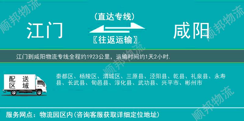 江门到咸阳物流专线全程约1923公里,专线运输耗时约1天2小时, 江门到咸阳物流专线是顺邦物流重点打造物流线路之一,找江门到咸阳物流公司就选顺邦物流,我们将竭诚为您提供专业江门到咸阳物流货运服务。
