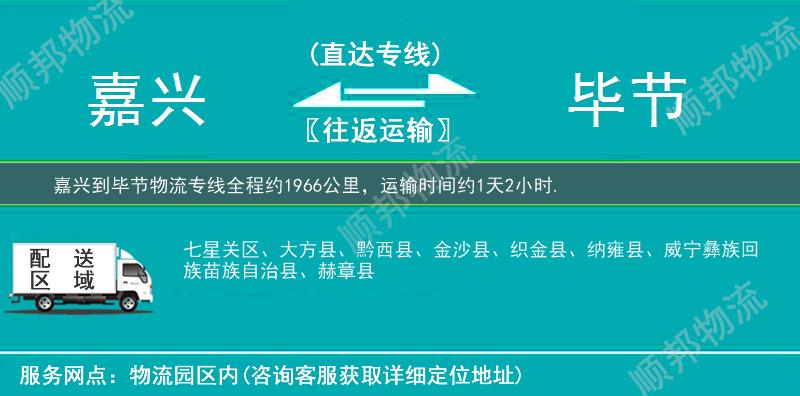 嘉兴到毕节物流专线专业是顺邦物流重点运营货运专线,提供嘉兴至毕节搬家行李托运,冷链运输,大件运输,航空托运,小轿车托运,电商物流,整车零担货运,超市配送业务。嘉兴到毕节物流专线全程约1966公里,专线运输耗时约1天2小时。