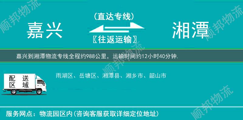 嘉兴到湘潭物流专线全程约988公里,专线运输耗时约12小时40分钟, 嘉兴到湘潭物流专线是顺邦物流的主营运输专线,每日定时发车,高速直达。嘉兴到湘潭专线提供零担整车、大件、仓储配送、展会、包车等多种运输方式,让客户轻松享受"足不出户,货到湘潭"的物流运输服务。