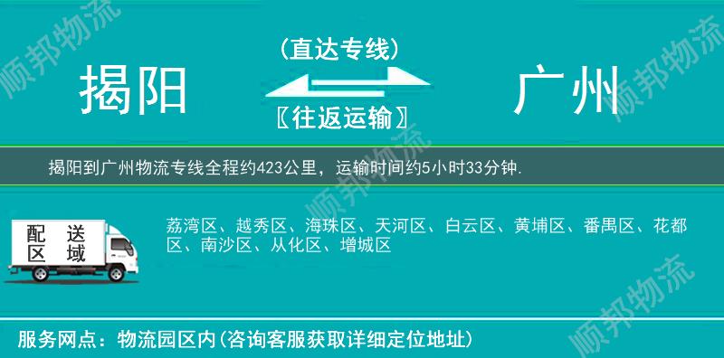 揭阳到广州物流专线专业是顺邦物流重点运营货运专线,提供揭阳至广州搬家行李托运,冷链运输,大件运输,航空托运,小轿车托运,电商物流,整车零担货运,超市配送业务。揭阳到广州物流专线全程约423公里,专线运输耗时约5小时33分钟。