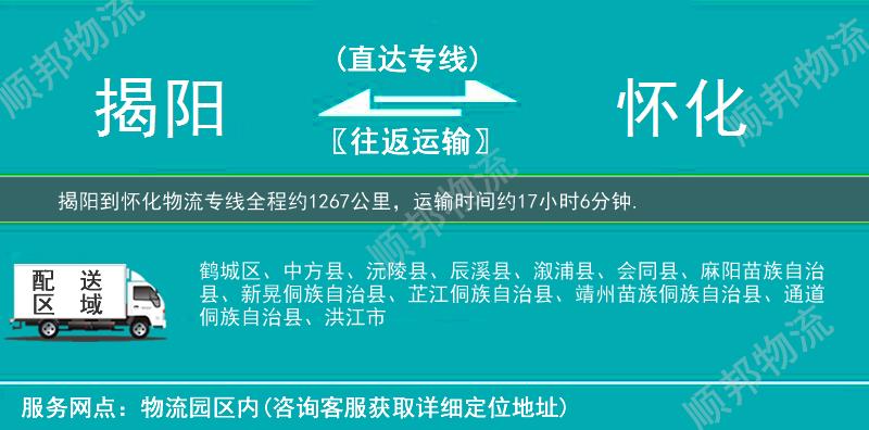 揭阳到怀化物流专线全程约1267公里,专线运输耗时约17小时6分钟。揭阳到怀化物流专线是顺邦物流的主营货运专线,专业揭阳至怀化物流公司,提供上门收货和派送到门服务,高品质从揭阳发货到怀化,揭阳物流到怀化,就选顺邦物流。