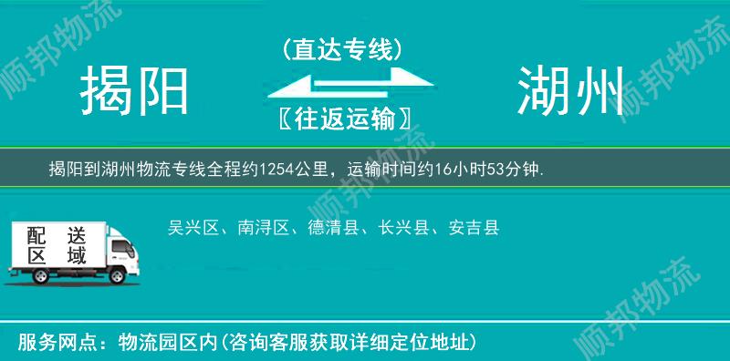 同时,顺邦物流为了方便广大客户从揭阳到湖州的不同运输时效和物流成本要求,顺邦物流特推出揭阳到湖州物流公司相关业务,以此来降低从揭阳到湖州运输的物流成本,提高揭阳到湖州的物流效率,以便为新老客户提供更加完善的从揭阳到湖州的一站式*物流服务!