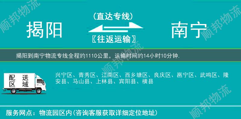 揭阳到南宁物流专线全程约1110公里,专线运输耗时约14小时10分钟。 揭阳到南宁物流专线是顺邦物流专业从揭阳发往南宁的直达物流专线。是专门为需要从揭阳地区发货运到南宁地区的客户提供的到南宁的专线货物快运服务。