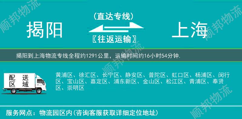 揭阳到上海物流专线全程约1291公里,专线运输耗时约16小时54分钟。揭阳到上海物流专线是顺邦物流推出的从揭阳到上海的物流专线直达运输,提供揭阳到上海货运公司电话查询价格和费用,快速安全将货物送达,做用户放心的货运物流服务商。