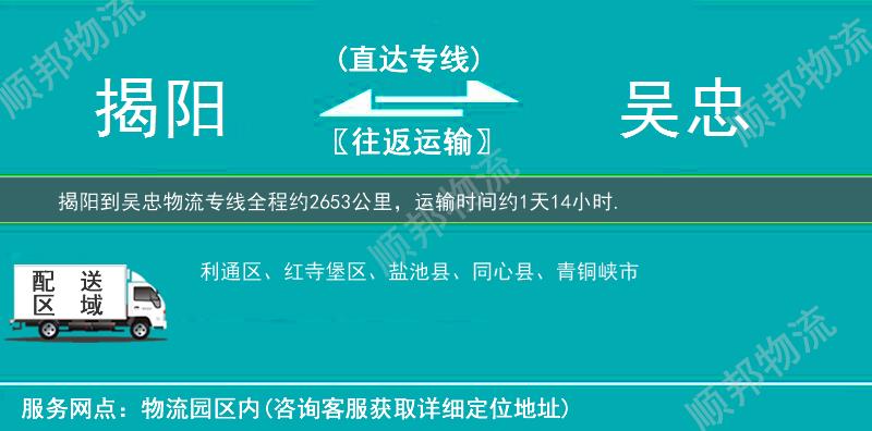 揭阳到吴忠物流专线全程约2653公里,专线运输耗时约1天14小时 揭阳到吴忠物流专线是顺邦物流开展揭阳到全国物流运输专线其中一条专线,专门承接揭阳到吴忠全市各类产品托运的货物物流运输项目,长期为企业、工厂、贸易商、批发商等货主解决揭阳到吴忠物流运输、揭阳到吴忠货运服务、整车零担专线运输。