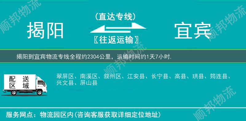 揭阳到宜宾物流专线全程约2304公里,专线运输耗时约1天7小时 揭阳到宜宾物流专线是顺邦物流开展揭阳到全国物流运输专线其中一条专线,专门承接揭阳到宜宾全市各类产品托运的货物物流运输项目,长期为企业、工厂、贸易商、批发商等货主解决揭阳到宜宾物流运输、揭阳到宜宾货运服务、整车零担专线运输。