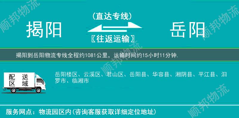 ★ 声明:本文"揭阳到岳阳物流专线_一站式托运「多少公里」"由顺邦物流原创发布,转载请保留本文链接:http://www.lyhawl.com/jieyang/yueyang-wuliu.html