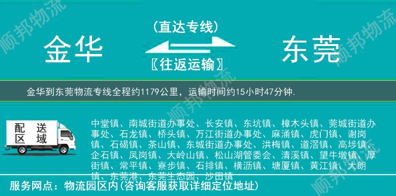 金华到东莞物流专线专业是顺邦物流重点运营货运专线,提供金华至东莞搬家行李托运,冷链运输,大件运输,航空托运,小轿车托运,电商物流,整车零担货运,超市配送业务。金华到东莞物流专线全程约1179公里,专线运输耗时约15小时47分钟。