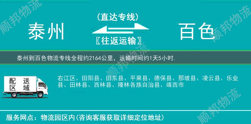 ★ 本站所列泰州到百色物流专线费用与时效仅供参考,如需详细了解收费标准请电话咨询。
