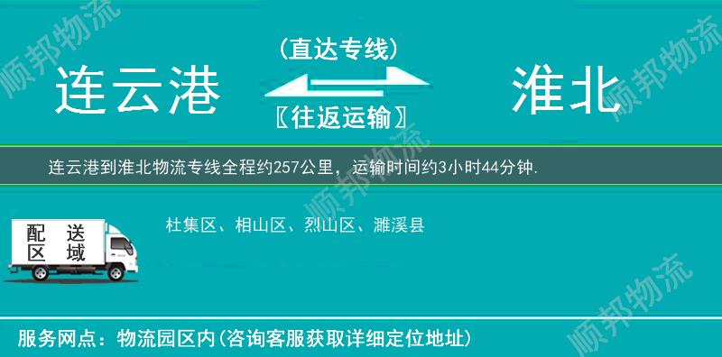 连云港到淮北货运公司是顺邦物流的*线路,长期为各类大中型企业、工厂解决连云港发往淮北货运物流线路支持,连云港至淮北货运专线的货物运输服务。天天发车,可送货到达以下地点:相山区、烈山区、杜集区、濉溪县、。