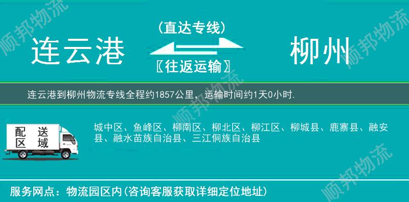 连云港到柳州物流专线全程约1857公里,专线运输耗时约1天0小时。连云港到柳州物流专线是顺邦物流的主营货运专线,专业连云港至柳州物流公司,提供上门收货和派送到门服务,高品质从连云港发货到柳州,连云港物流到柳州,就选顺邦物流。