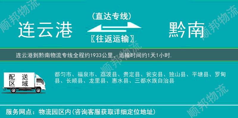 连云港到黔南物流专线全程约1933公里,专线运输耗时约1天1小时, 连云港到黔南物流专线是顺邦物流重点打造物流线路之一,找连云港到黔南物流公司就选顺邦物流,我们将竭诚为您提供专业连云港到黔南物流货运服务。
