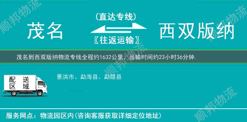 茂名到西双版纳物流专线全程约1632公里,专线运输耗时约23小时36分钟。 茂名到西双版纳物流专线是顺邦物流专业从茂名发往西双版纳的直达物流专线。是专门为需要从茂名地区发货运到西双版纳地区的客户提供的到西双版纳的专线货物快运服务。
