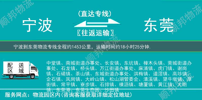 宁波到东莞物流专线全程约1453公里,专线运输耗时约18小时25分钟。 宁波到东莞物流专线是顺邦物流专业从宁波发往东莞的直达物流专线。是专门为需要从宁波地区发货运到东莞地区的客户提供的到东莞的专线货物快运服务。