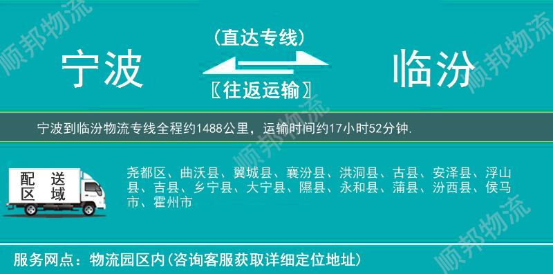 ★ 声明:本文"宁波到临汾物流专线_运费多少「高速快运」"由顺邦物流原创发布,转载请保留本文链接:http://www.lyhawl.com/ningbo/linfen-wuliu.html