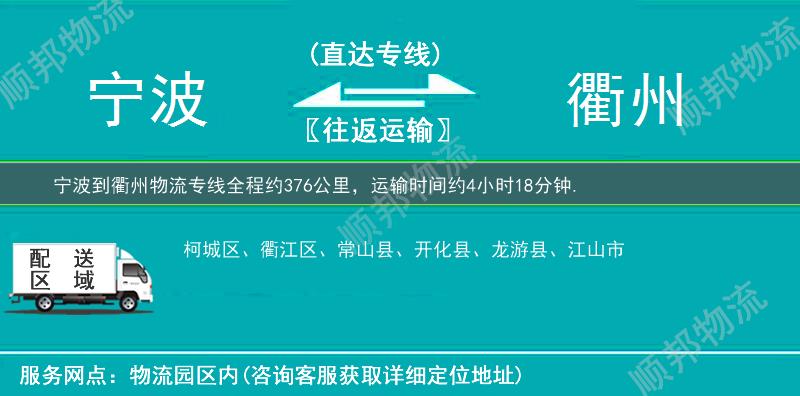 宁波到衢州物流专线全程约376公里,专线运输耗时约4小时18分钟。宁波到衢州物流专线是顺邦物流推出的从宁波到衢州的物流专线直达运输,提供宁波到衢州货运公司电话查询价格和费用,快速安全将货物送达,做用户放心的货运物流服务商。