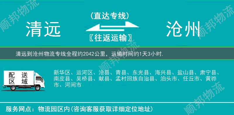 清远到沧州物流专线专业是顺邦物流重点运营货运专线,提供清远至沧州搬家行李托运,冷链运输,大件运输,航空托运,小轿车托运,电商物流,整车零担货运,超市配送业务。清远到沧州物流专线全程约2042公里,专线运输耗时约1天3小时。