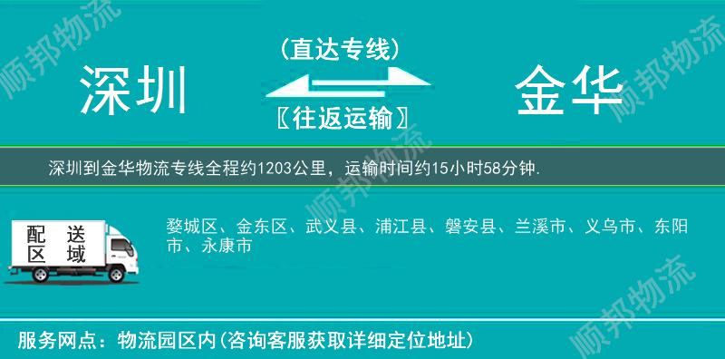 深圳到金华物流专线是顺邦物流从深圳发往至金华的物流货运专线,天天发车二到三天即可抵达,金华可送货的范围包括: 婺城区、永康市、武义县、浦江县、金东区、东阳市、兰溪市、磐安县、义乌市、。