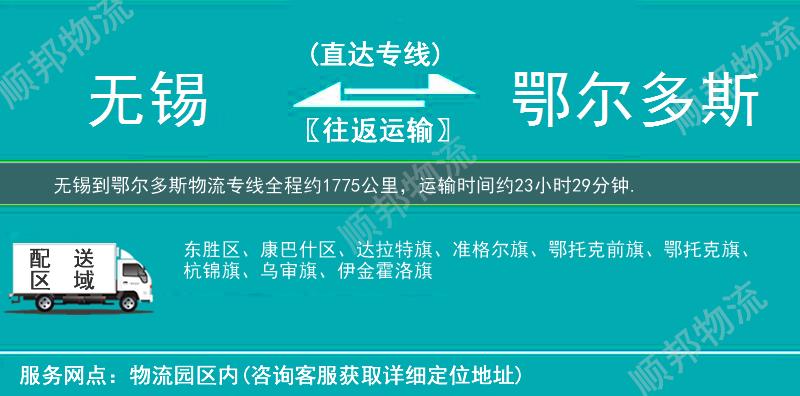无锡到鄂尔多斯物流专线全程约1775公里,专线运输耗时约23小时29分钟。无锡到鄂尔多斯物流专线是顺邦物流的主营货运专线,专业无锡至鄂尔多斯物流公司,提供上门收货和派送到门服务,高品质从无锡发货到鄂尔多斯,无锡物流到鄂尔多斯,就选顺邦物流。