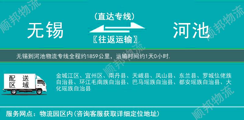 欢迎来电咨询无锡到河池物流专线相关信息,天天发货,全程3-7天可将您的货物送至河池全市:南丹县、天峨县、金城江区、环江毛南族自治县、凤山县、罗城仫佬族自治县、巴马瑶族自治县、大化瑶族自治县、东兰县、都安瑶族自治县、宜州区、。