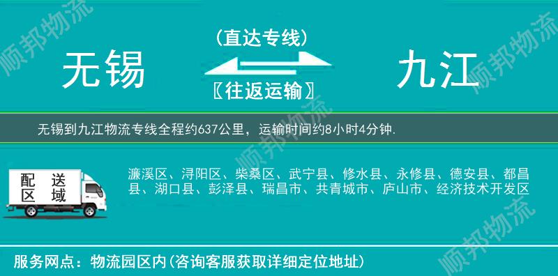 无锡到九江物流专线全程约637公里,专线运输耗时约8小时4分钟。 *无锡到九江物流公司,专业无锡到九江物流专线运输(上门取货 送货到门)从 无锡发货运去九江、 无锡发物流到九江,一站式 无锡到九江专线直达物流。