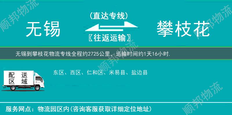 无锡到攀枝花物流专线是顺邦物流从无锡发往至攀枝花的物流货运专线,天天发车二到三天即可抵达,攀枝花可送货的范围包括: 西区、仁和区、盐边县、米易县、东区、。