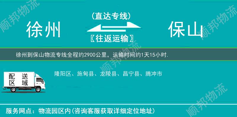 徐州到保山物流专线全程约2900公里,专线运输耗时约1天15小时。徐州到保山物流专线是顺邦物流的主营货运专线,专业徐州至保山物流公司,提供上门收货和派送到门服务,高品质从徐州发货到保山,徐州物流到保山,就选顺邦物流。