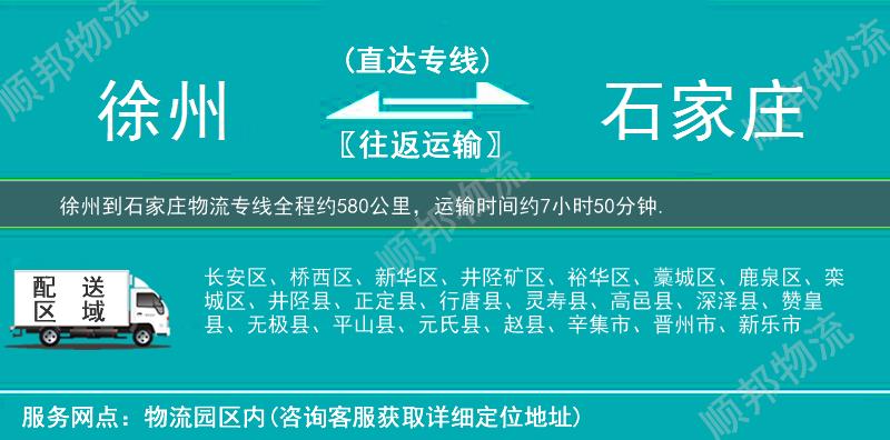 徐州到石家庄物流专线专业是顺邦物流重点运营货运专线,提供徐州至石家庄搬家行李托运,冷链运输,大件运输,航空托运,小轿车托运,电商物流,整车零担货运,超市配送业务。徐州到石家庄物流专线全程约580公里,专线运输耗时约7小时50分钟。