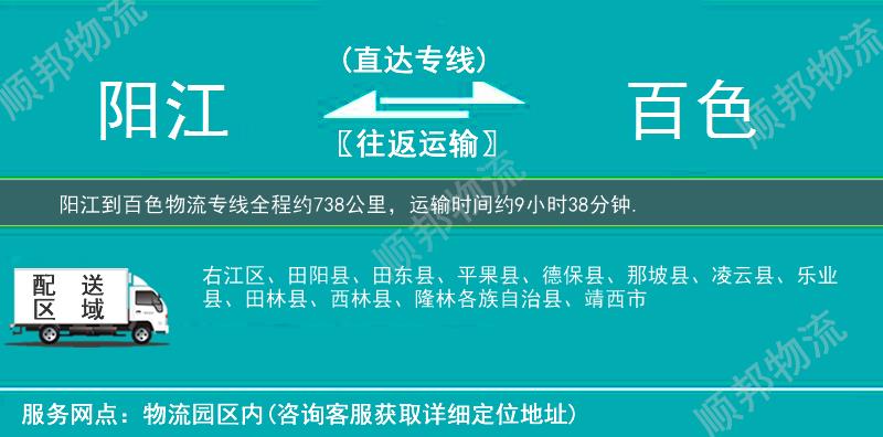 阳江到百色物流专线全程约738公里,专线运输耗时约9小时38分钟。 *阳江到百色物流公司,专业阳江到百色物流专线运输(上门取货 送货到门)从 阳江发货运去百色、 阳江发物流到百色,一站式 阳江到百色专线直达物流。