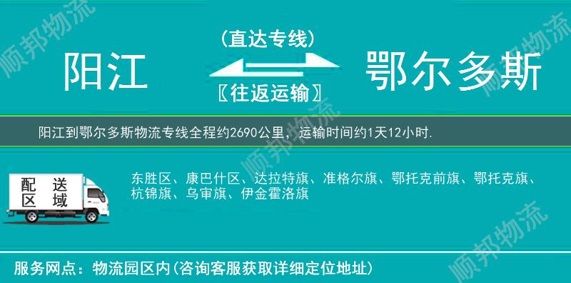 阳江到鄂尔多斯物流专线全程约2690公里,专线运输耗时约1天12小时, 阳江到鄂尔多斯物流专线是顺邦物流重点打造物流线路之一,找阳江到鄂尔多斯物流公司就选顺邦物流,我们将竭诚为您提供专业阳江到鄂尔多斯物流货运服务。