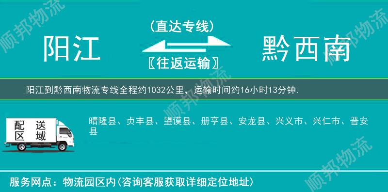阳江到黔西南物流专线是顺邦物流从阳江发往至黔西南的物流货运专线,天天发车,二到三天即可抵达,黔西南可送货的范围包括:兴仁市、贞丰县、册亨县、兴义市、普安县、望谟县、安龙县、晴隆县、。