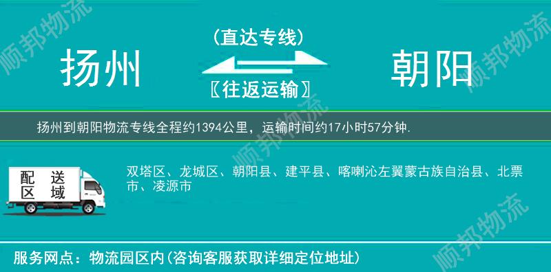 扬州到朝阳物流专线专业是顺邦物流重点运营货运专线,提供扬州至朝阳搬家行李托运,冷链运输,大件运输,航空托运,小轿车托运,电商物流,整车零担货运,超市配送业务。扬州到朝阳物流专线全程约1394公里,专线运输耗时约17小时57分钟。