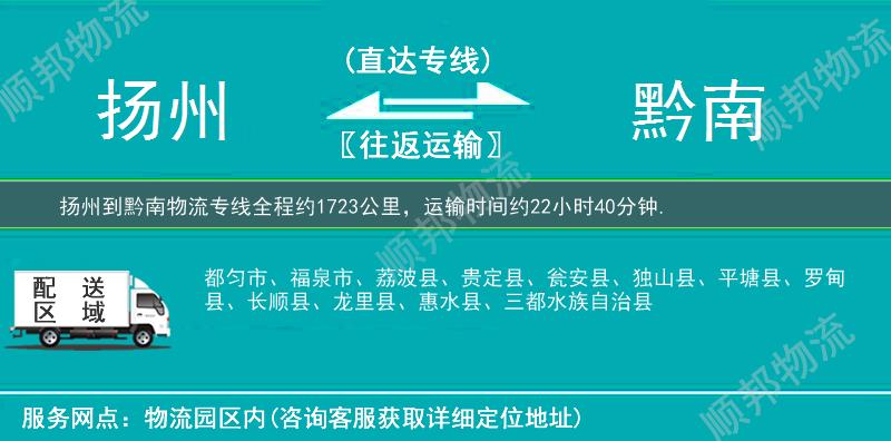 扬州到黔南物流专线可以提供门到门服务,在扬州、宝应县、江都区、广陵区、仪征市、高邮市、邗江区、经济开发区、等地都设有门店,提供上门提货、送货上门服务。