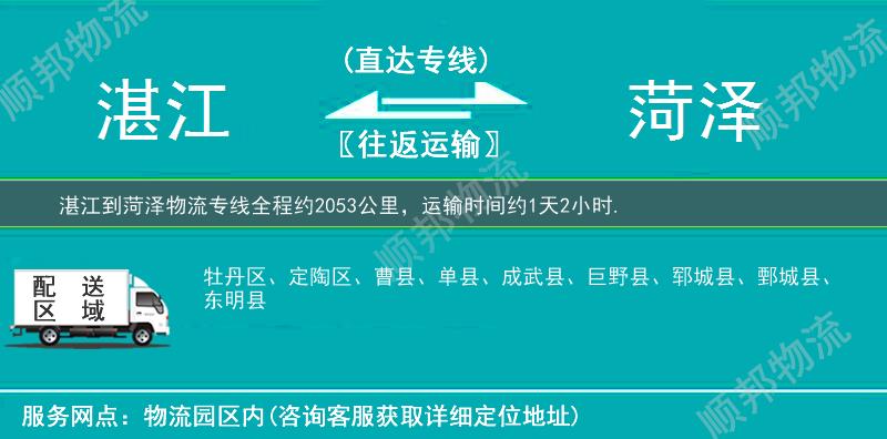 湛江到菏泽物流专线全程约2053公里,专线运输耗时约1天2小时。湛江到菏泽物流专线是顺邦物流推出的从湛江到菏泽的物流专线直达运输,提供湛江到菏泽货运公司电话查询价格和费用,快速安全将货物送达,做用户放心的货运物流服务商。