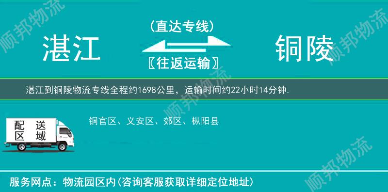 湛江到铜陵物流专线全程约1698公里,专线运输耗时约22小时14分钟, 湛江到铜陵物流专线是顺邦物流重点打造物流线路之一,找湛江到铜陵物流公司就选顺邦物流,我们将竭诚为您提供专业湛江到铜陵物流货运服务。