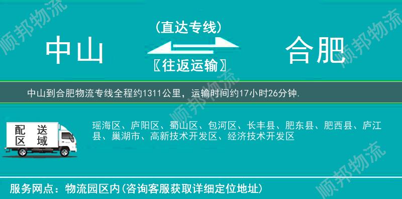 中山到合肥物流专线全程约1311公里,专线运输耗时约17小时26分钟。中山到合肥物流专线是顺邦物流推出的从中山到合肥的物流专线直达运输,提供中山到合肥货运公司电话查询价格和费用,快速安全将货物送达,做用户放心的货运物流服务商。